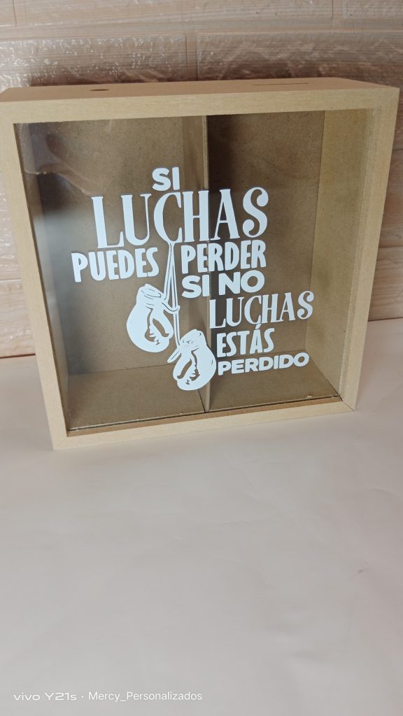 Cada alcancía se elabora bajo pedido y se personaliza con frase, nombre o diseño en vinilo decorativo de alta calidad. Son perfectas como regalo especial o para empezar una meta de ahorro.